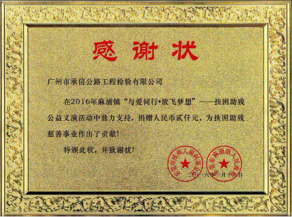 我司榮獲2016年東莞市麻涌鎮(zhèn)扶困助殘感謝狀