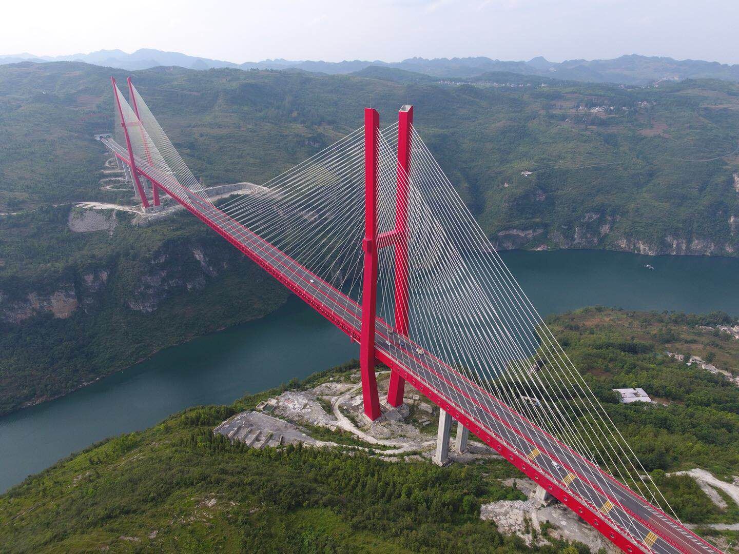 鴨池河特大橋跨越深切峽谷,兩岸地勢陡峭,橋面至水面高差達312m,距離河谷底部433m。橋梁全長1466.5m,主橋為主跨800m的雙塔雙索面鋼桁梁斜拉橋 ,是中國跨徑最大的山區(qū)斜拉橋,也是世界跨徑最大的鋼桁梁斜拉橋。